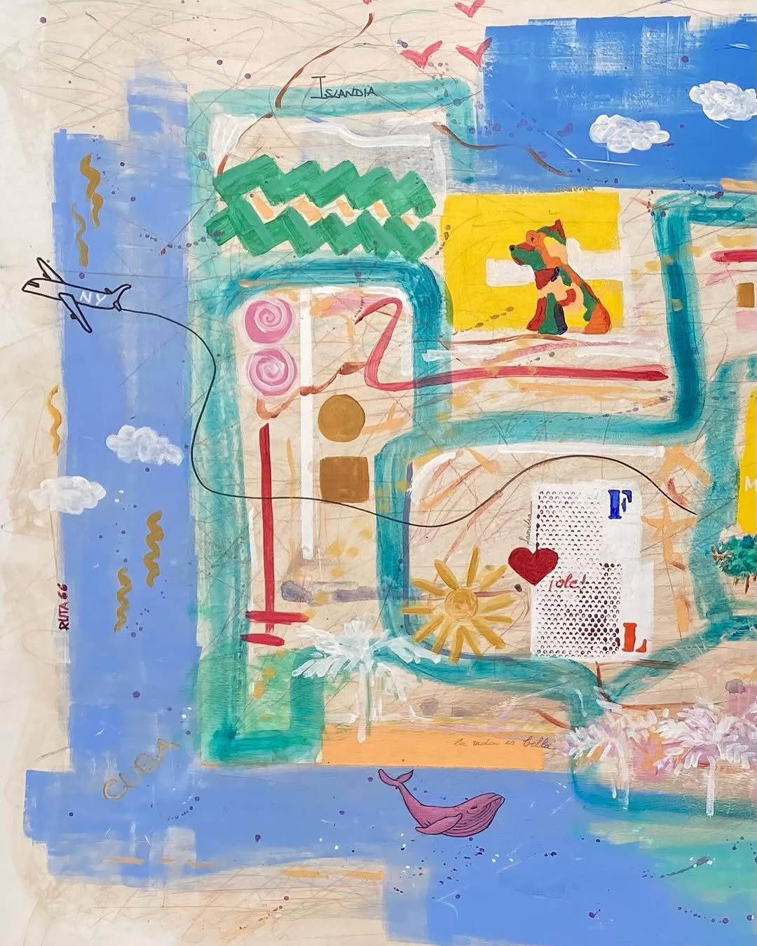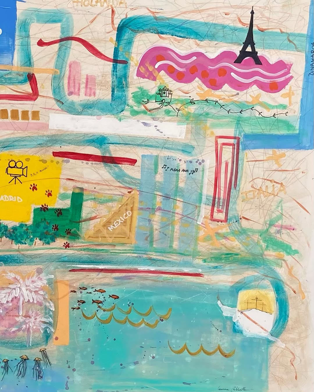 Os muestro mi ultimo cuadro, querían algo moderno, lleno de color para el salón de su casa familiar de vacaciones y el resultado ha sido un “Mapa de vida” , un “callejero” de esta familia viajera, que disfruta de cada momento de la vida y para mi ha sido un disfrute realizarlo ☺️