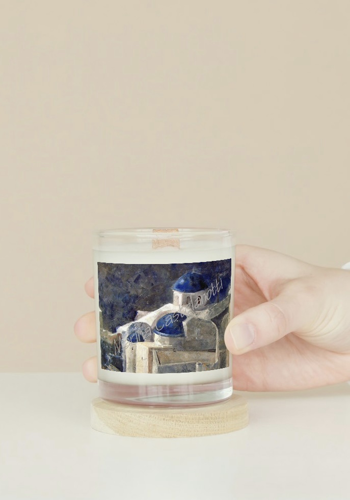 Vela aromatizada en un tarro de cristal de la obra «Santorini» de Marina Castelanotti.